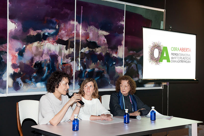 La presidenta de la Fundación Caja de Extremadura, Pilar García Ceballos-Zúñiga, junto a la presidenta de la Factoría Cultural de Matadero de Madrid y exdirectora de Arco, Rosina Gómez-Baeza; y Gabriela Bettini, la artista madrileña galardonada en la pasada edición, han presentado la convocatoria de la próxima edición de Obra Abierta 2018.