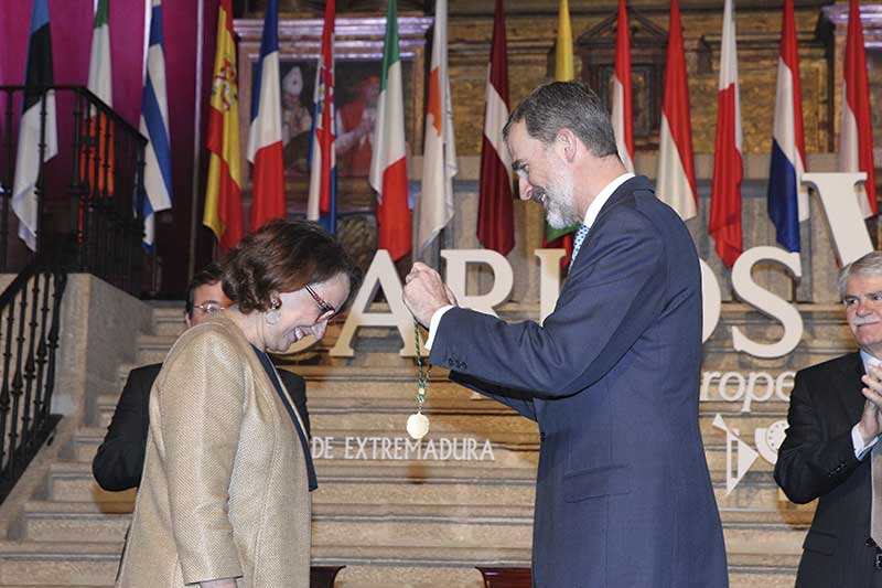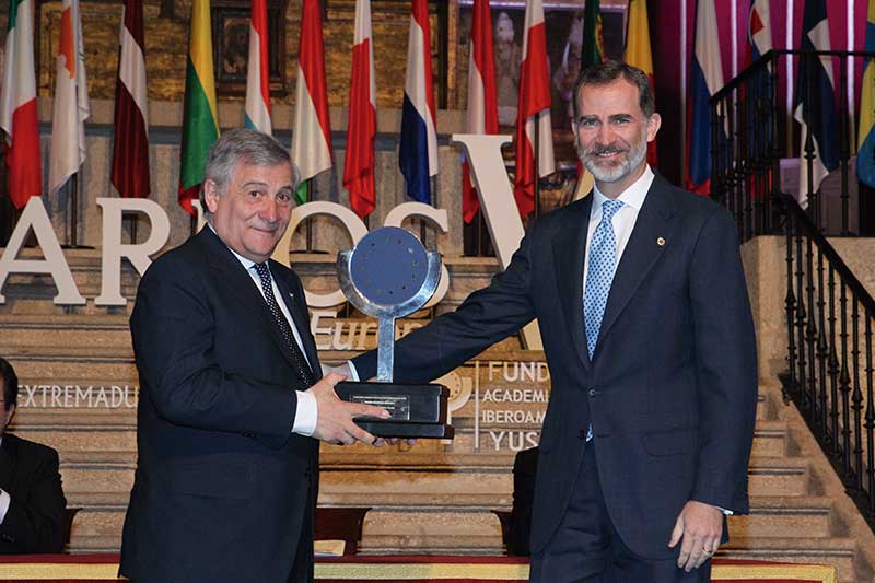 Por primera vez bajo su nueva denominación, la Fundación Academia e Iberoamericana de Yuste ha entregado el XII Premio Europeo Carlos V, que ha recaído en el presidente del Parlamento Europeo, Antonio Tajani. En la ceremonia, presidida por el Rey Felipe VI, también ha participado el presidente de la Junta de Extremadura, Guillermo Fernández Vara; y han asistido, entre otros, el ministro de Asuntos Exteriores, Alfonso María Dastis; anteriores galardonados, como Felipe González, Jorge Sampaio, Sofia Corradi y Marcelino Oreja; el expresidente del Parlamento Europeo José María Gil-Robles; los miembros de la Academia Europea e Iberoamericana de Yuste Manuela Mendonça y Juan Carlos Rodríguez Ibarra; y los embajadores de Polonia, Irlanda, Eslovenia, Letonia, Estonia, Reino Unido, Finlandia, Brasil, Perú, Costa Rica, Italia, Luxemburgo, Hungría, Alemania y Portugal.
