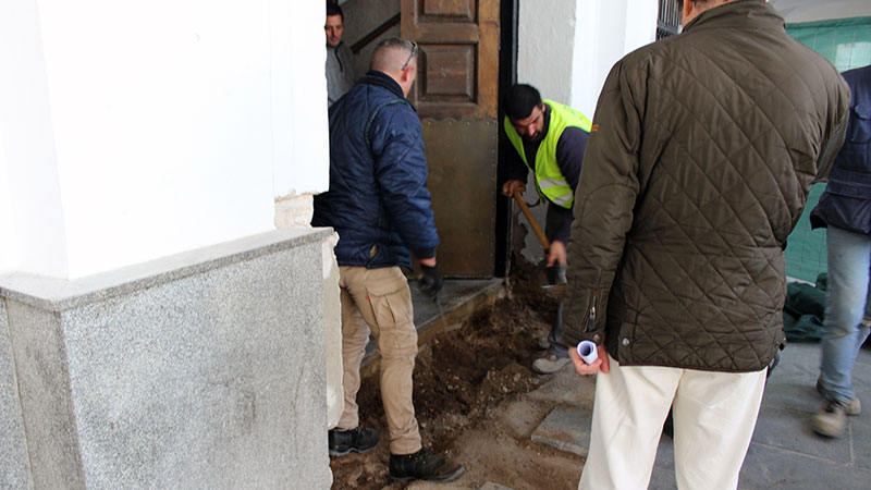 En concreto, se trata de intentar rebajar el zócalo de la entrada principal del Ayuntamiento para que puedan acceder al mismo las personas con movilidad reducida. Para ello se ha retirado el gran zócalo de mármol que existía en la puerta y se va a proceder a su colocación a ras de suelo.