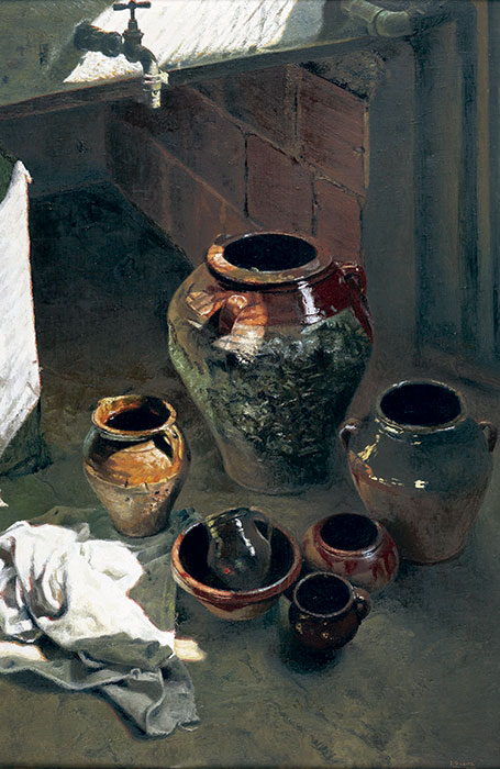 Destacan en este lienzo las haces de luz que chocan con superficies refractantes o traslúcidas. La luz es el principal polo de atracción del cuadro.