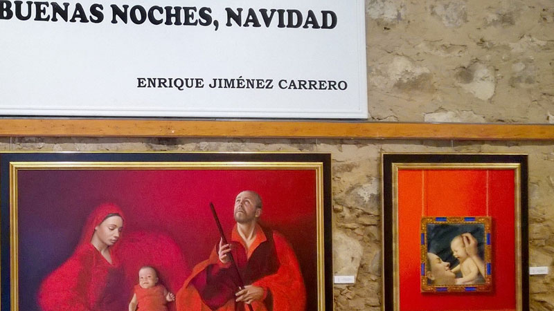‘Buenas noches, Navidad’ es el título de su última exposición en el Museo Etnográfico Extremeño González Santana de Olivenza, junto a la imponente Torre del Homenaje. En el ecuador de la Navidad, pasamos por Badajoz y recordamos a nuestros amigos que allí viven, pero a los que no molestamos ni con una llamada, porque su día será otro, tan cercano como ansiado. Toca hoy el reencuentro con nuestro pueblo en Olivenza, con la luz perdida de nuestros ojos que el primo Enrique traslada a sus cuadros, ahora de época roja, las figuras enmarcadas en fondo encarnado: la Navidad en el portal, la Sagrada Familia, la adoración del ángel, el Niño tal cual vino al mundo, arropado, sostenido, brillante… ‘Buenas noches, Navidad’, en su ecuador mismo, dando luz a las de las calles de Olivenza. En el recuerdo de la recreación de la Navidad, Enrique traslada sus cartas a los Reyes, pintadas sobre el cuadro, como los juguetes deseados que no hubiéremos: los cochecitos, los zapatitos…, con los trozos de papel rasgados de su pintura, pero insertos en ella; como los recuerdos que el destierro no nos arrebatare nunca, ni el pantano cubriere con sus aguas.