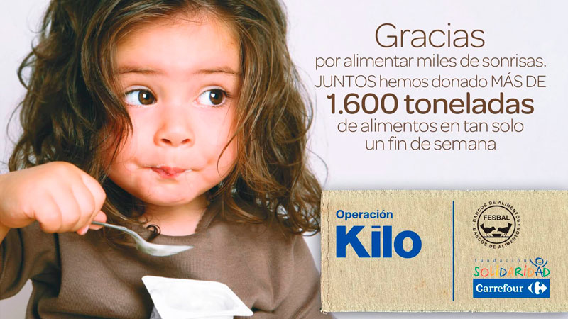 En 2018, a nivel nacional Carrefour, con el apoyo de sus clientes y colaboradores, entregó a la Federación Española de Bancos de Alimentos más de 9,5 millones de kilogramos de alimentos, de los cuales el 72% fueron aportados directamente por Carrefour. Dichas aportaciones son fruto de las diferentes jornadas de recogida de alimentos que Carrefour celebró en sus centros y, a su vez, de las correspondientes donaciones directas realizadas por la compañía. Unos alimentos que, se estima, sirvieron para ayudar a atender las necesidades básicas en materia de alimentación de más de 95.000 personas durante todo un año.