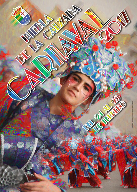 El ganador del concurso, Dionisio Sánchez, de estudio gráfico ‘Infinito’, ha basado el diseño del cartel en las fotografías de Teodoro Gracia del pasado Carnaval, hechas a la comparsa ‘Vas como quieres’, que este año celebra su vigésimo quinto aniversario, conmemorándolo con una exposición sobre su trayectoria. El diseñador ha utilizado el colorido que mostraba la comparsa en su vestuario del carnaval del año pasado para hacerlo homogéneo y atractivo. Es un cartel que consigue su objetivo, que sea muy llamativo a la vez que refleje lo que es y lo que se vive en Puebla de la Calzada cuando llegan estas fechas.