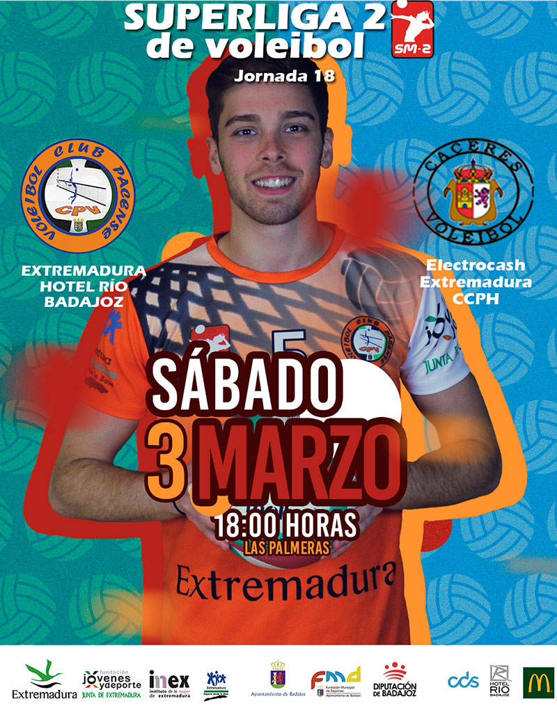 Esta tarde a las 18.00 horas en el pabellón ‘Las Palmeras’ de Badajoz tendrá lugar la última jornada de la liga regular de la Superliga 2 de voleibol, con el derbi entre el Extremadura Hotel Río Badajoz y el Electrocash Extremadura Cáceres Patrimonio de la Humanidad.