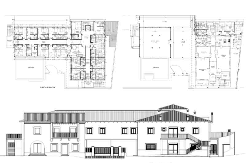 En la primera planta y en forma de ‘L’ se sitúan las habitaciones, todas con baño, a ambos lados del pasillo de distribución central. También se ubican en esta planta las dependencias destinadas a enfermería, rehabilitación y terapia ocupacional y almacén.