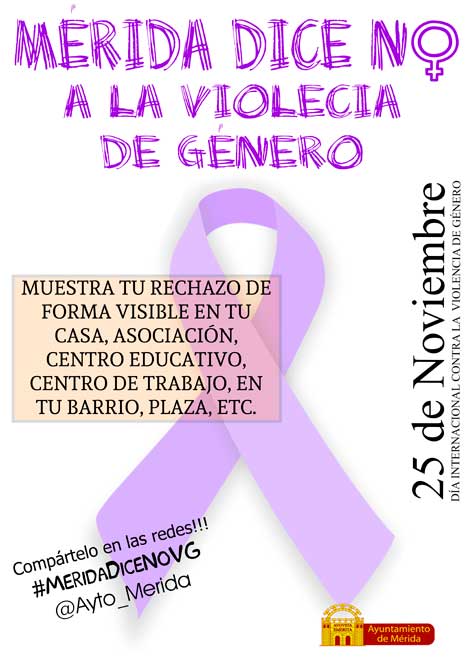 La delegación ha puesto en marcha la campaña ‘Mérida dice no a la violencia de género’ para “sensibilizar, informar y formar en igualdad de oportunidades entre mujeres y hombres y prevenir la violencia machista”. Esta campaña propone a toda la ciudadanía participar dando una respuesta firme y para visibilizar el rechazo por medio de carteles y lazos colocados de manera visible, en las casas, asociaciones, centros educativos, centros de trabajo… Y también a través de las redes sociales, utilizando el hastag #MeridaDiceNoVG y compartiéndolo.