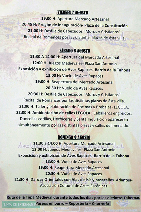 La feria se inaugurará a las 20.45 horas del viernes, con la lectura del pregón en la Plaza de la Constitución, a la que seguirá un desfile de cabezudos. El sábado el mercado permanecerá abierto entre las 11.30 horas y las 14.00 horas, y habrá juegos medievales instructivos realizados en talleres específicos durante todo el año en el pueblo. A las 19.00 se vuelve a abrir el mercado y se repetirá la exhibición de aves rapaces a las 20.30 horas, así como un desfile de moros y cristianos; también se podrá participar en un taller de elaboración de pócimas y pociones. El domingo por la tarde habrá danzas orientales y un pasacalles a cargo del grupo ‘Adantea’.