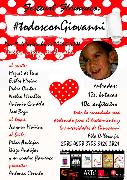 El Teatro López de Ayala de Badajoz alberga el jueves día 15 de septiembre a partir de las 21.00 horas un festival flamenco en el que artistas como Miguel de Tena, Esther Merino, Pilar Andújar o Joaquín Muñino unen su arte por el niño Giovanni Miralles.