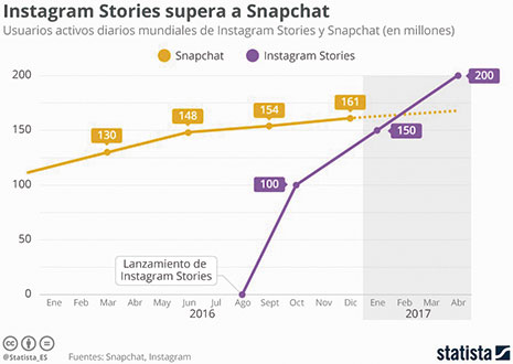 Las ‘Stories’ de Instagram han sido un auténtico bombazo, pasando por encima a Snapchat, al que ha quedado hasta obsoleto por no tener ese punto de cercanía del aquí y ahora. Se cree que este subidón de usuarios puede estar sustentado en esta característica de Instagram, que acumula más de 250 millones de personas al día, mucho más que el número de usuarios de Snapchat. Brutal, ¿no crees?