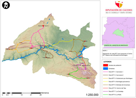Las rutas tienen tres niveles de dificultad que se identifican por colores (muy difícil -negra-, difícil -roja- y fácil -azul-) atendiendo a su dificultad técnica. La única ruta negra es circular y conecta Villareal de San Carlos, Malpartida de Plasencia, la Estación de Palazuelo y Serradilla; las rutas rojas son dos, también circulares, y conectan Villareal de San Carlos y Torrejón el Rubio; y Serradilla, Mirabel, y Casas de Millán; y entre las azules hay dos circulares (por Toril, Serrejón, Saucedilla y Casatejada; y por Higuera, Casas de Miravete y Romangordo), y tres lineales (de Villarreal de San Carlos a Toril; de Serrejón a Higuera; y de Casas de Miravete a Deleitosa, pasando por Jaraicejo).