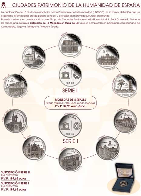 La serie de monedas ‘Ciudades Patrimonio de la Humanidad’, emitida por la Fábrica Nacional de Moneda y Timbre-Real Casa de la Moneda, consta de 15 piezas dedicadas a las ciudades españolas reconocidas por la Unesco como Patrimonio Mundial: Alcalá de Henares, Ávila, Baeza, Cáceres, Córdoba, Cuenca, Ibiza, Mérida, Salamanca, San Cristóbal de la Laguna, Santiago de Compostela, Segovia, Tarragona, Toledo y Úbeda. Acuñadas en plata de ley con calidad ‘proof’, las monedas tienen un facial de 5 euros.
