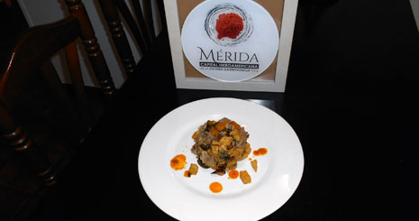 La Capitalidad Iberoamericana de la Cultura Gastronómica de Mérida ha llevado a que Sole dedique un plato cada mes a cada uno de los países que conforman la Academia Iberoamericana de la Gastronomía. Para Grada nos prepara una chorrillana, un plato típico chileno que ha gustado mucho entre los comensales y que cosechado un buen éxito de críticas. La chorrillana es fácil de hacer, pero al modo de Sole está mejor que el que se prepara en su tierra natal. El secreto está en que mientras los chilenos utilizan cerdo blanco para su realización Sole ha usado presa ibérica a la parrilla. Los demás ingredientes son patatas fritas, cebolla y pimiento, además de esta exquisita carne. Este plato se ha maridado con gran acierto con un tinto Madre del Agua, de Viña Puebla. De postre nos ofrece un pastel de papaya, compuesto de un bizcocho ligeramente borracho, nata y papaya.