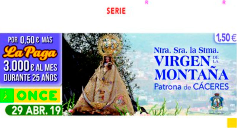 La ONCE se acerca a uno de los símbolos de Cáceres dedicado su cupón de mañana lunes, 29 de abril, a la Virgen de la Montaña, patrona de la ciudad, con cinco millones y medio de cupones llevando esta imagen por toda España.