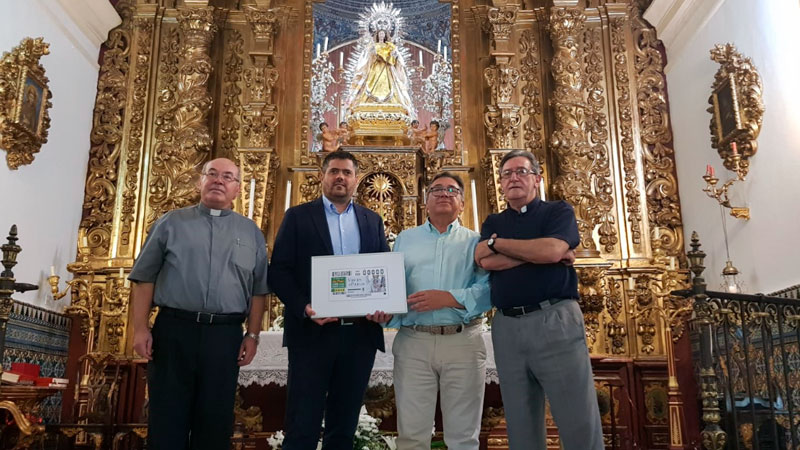 La patrona de la localidad pacense de Almendralejo es la imagen este jueves 15 de agosto de 5,5 millones de cupones de la ONCE, que difundirán esta talla por toda España, un cupón que fue presentado por el delegado territorial de la ONCE en Extremadura, Fernando Iglesias, y el alcalde de Almendralejo, José María Ramírez, acompañados por el párroco y vicario episcopal, Rafael Corraliza.
