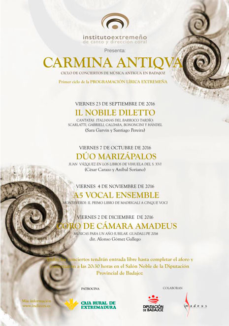 En el cartel de este nuevo programa destacan formaciones y artistas profesionales de reconocido prestigio que en algunos casos visitan por primera vez Extremadura. Además, dos de los conciertos estarán dedicados a obras, fuentes, melodías y músicos vinculados a la realidad cultural extremeña. Cobran interés en este sentido los que se conforman sobre la figura de Juan Vázquez a cargo del dúo ‘Marizápalos’; y el que realizará el coro extremeño Amadeus con obras inéditas conservadas en los archivos del Real Monasterio de Santa María de Guadalupe.