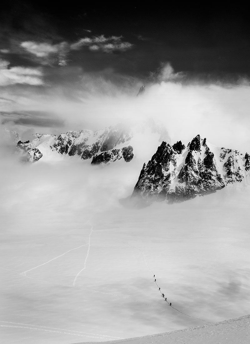 José Vicente Arnelas (Badajoz, 1987). Fotografía realizada en el Mont Blanc, en los Alpes ítalo franceses, a unos 5.000 metros de altura y a unos 600 metros de la cúspide. La mitad occidental de la montaña corresponde al estado francés y la mitad oriental al italiano. En la fotografía se encuadra el pico del ‘diente del gigante’, al que se dirigen unos montañeros, sujetos anecdóticos. Intento mostrar la majestuosidad de la montaña en toda su naturaleza, inspirándome en la pintura romántica decimonónica de Caspar Friedrich y las fotografías de Ansel Adams. Fue tomada en junio de 2016, con una Canon G16.
