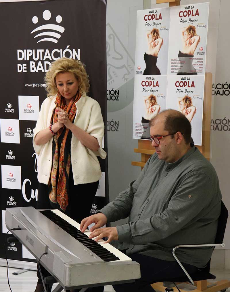 Pilar Boyero, una de las protagonistas de la última edición de los Premios Grada, acompañada al piano por el maestro Pedro Monty, son los protagonistas del programa ‘Vivir la copla’, que hará llegar este género a diez residencias de mayores de diferentes localidades de la provincia, en un proyecto patrocinado por la Diputación de Badajoz.