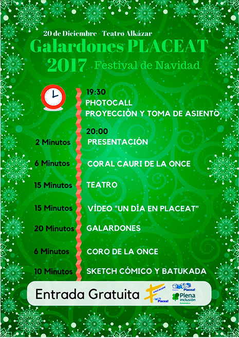 También se presentó el programa del Festival de Navidad, que tendrá lugar el próximo día 20 en el Teatro Alkázar. En él se entregarán los galardones Placeat y habrá actuaciones del coro de la ONCE y representaciones teatrales de usuarios de Placeat. La entrada es libre hasta completar el aforo.