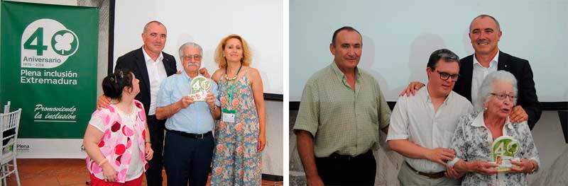 Plena inclusión Llerena rindió homenaje a Aurelia Merchán, una de sus socias fundadoras, quién estuvo acompañada por su amplia familia y recogió el premio del brazo de su hijo Aurelio. José Luis Pacheco, el presidente fundador de Aprosuba 7, fue el representante homenajeado por Plena inclusión Mérida; Pacheco ocupó además durante 18 años la secretaría de la federación regional. Antonia Carretera, de Plena inclusión Montijo, recogió el premio por su incansable participación en esta entidad. Andrea Díaz, una de las socias fundadoras en 1977 de Aprosuba 9, la actual Inclusives Villanueva, recibió el homenaje por ser un ejemplo de compromiso con el movimiento asociativo.