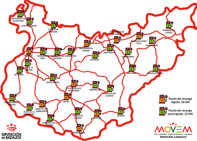 Los nueve puntos de recarga rápida estarán situados en Badajoz, Jerez de los Caballeros, Llerena, Monesterio, Navalvillar de Pela, San Pedro de Mérida, Villafranca de los Barros, Villanueva de la Serena y Zafra. Los 23 restantes se instalarán en Alburquerque, Azuaga, Cabeza del Buey, Calamonte, Campanario, Campillo de Llerena, Castuera, Don Benito, Fregenal de la Sierra, Fuente de Cantos, Guareña, Herrera del Duque, Hornachos, Oliva de la Frontera, Olivenza, Puebla de la Calzada, Puebla de Obando, Santa Marta de los Barros, San Vicente de Alcántara, Talarrubias, Talavera la Real y Villanueva del Fresno, y además en la finca La Cocosa, en las inmediaciones de Badajoz.