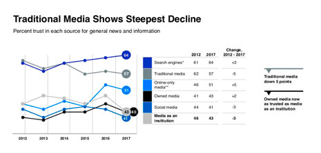 Edelman, la agencia de comunicación y relaciones públicas que más factura del mundo, ha publicado un estudio, con una muestra de 33.000 individuos de 28 países entre octubre y noviembre de 2016, que evalúa el grado de credibilidad de la comunicación de instituciones, empresas, ONGs y medios de comunicación. Apunta datos preocupantes, pues los españoles han disminuido su confianza en los medios de comunicación en cinco puntos, y España se mantiene en un nivel de confianza de 41 puntos entre la población mundial, en un estado ‘neutro’ de comunicación.