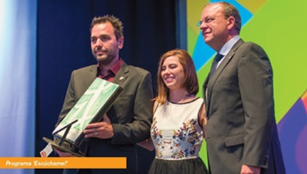 El último de los premios que se entregaron fue el que concede la propia Fundación Primera Fila, organizadora de la gala, a la mejor labor social en comunicación; en esta edición recayó en el programa de Canal Extremadura Televisión ‘Escúchame!’. El presidente del Gobierno de Extremadura, José Antonio Monago hizo entrega del mismo al director de la productora Primera Generación, Alberto Muñoz, y a su presentadora, Mamen Arroyo, que dieron las gracias por este galardón que les anima “a seguir luchando y avanzando en este camino que no es fácil para todos”, así como al colectivo extremeño de personas con discapacidad que hacen posible que este programa siga emitiéndose cada sábado en la televisión pública regional.