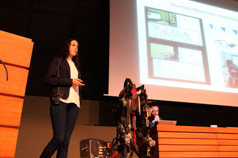 Cristina Bayón Calderón, del Centro de Automática y Robótica-CSIC, expuso el proyecto CPWalker, “una plataforma de rehabilitación robótica diseñada con el objetivo de mejorar la rehabilitación de la marcha en pacientes con parálisis cerebral o trastornos motores similares”.