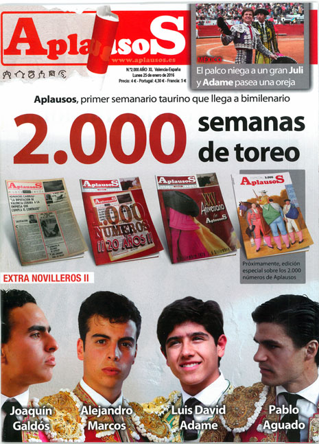 Unas horas después de escribir estas líneas estará en los quioscos de periódicos el número dos mil del semanario taurino ‘Aplausos’. Han pasado 40 años desde la aparición del primer número.Fue en Valencia, el 6 de diciembre de 1976, de la mano de Salvador Pascual Benet, editor y propietario del mismo y, con el paso del tiempo, también director de la publicación. Es un hito en las publicaciones generalistas llegar a esta cifra pero aun lo es más en las taurinas.