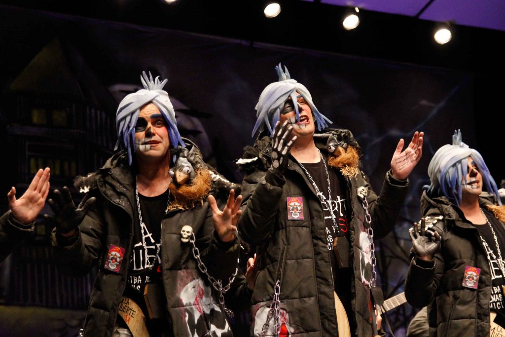 Antes del descanso había que ver a Espantaperros. Son trabajadores de la Muerte S.A. Nada más subir el telón los Espantaperros sorprenden porque se aprecia un cambio de estilo. Los disfraces son muy disitintos a los que nos tienen acostumbrado y el escenario es espectacular. En la esquina, su padre, la Muerte a quien les canta en varias ocasiones. En sus pasodobles se acordaron de la actuación del pasado año y de la donación de órganos.