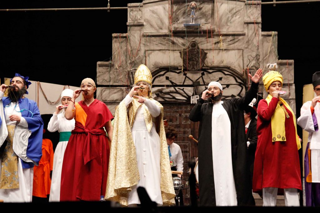 Este año proponen un tipo arriesgado, son distintas religiones. Cantaron un sentido pasodoble al caso de la manada. No llegaron a conectar del todo con el público durante los cuplés y lo más aplaudido fue la actuación del Papa Francisco. Cabe destacar el “Papa-móvil” que se trabajaron, muy conseguido. En el popurrí tocaron temas nacionales y locales y apareció Dios, con el disfraz de los Water del pasado año. El final cantando a las murgas históricas fue lo mejor. Idea compleja y difícil de desarrollar pero accesible para todas las personas.
