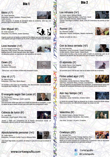 Durante las proyecciones se podrán ver 16 cortometrajes de género y temática variada, desde el drama hasta la comedia o trabajos más dinámicos e innovadores. La duración de las películas también será diversa, combinando historias de un cierto desarrollo argumental con relatos más breves de apenas unos minutos que realizan un ejercicio de síntesis sorprendente para narrar en tan corto espacio de tiempo. Además, el público será el protagonista al determinar cuál es el trabajo ganador del festival, ya que serán los mismos espectadores los que elijan, a través de papeletas de votación, qué cortometraje merece alzarse con el primer premio. Con esta iniciativa se pretende implicar a los asistentes más allá del mero visionado e involucrarles en una valoración activa y crítica de lo visto en pantalla.
