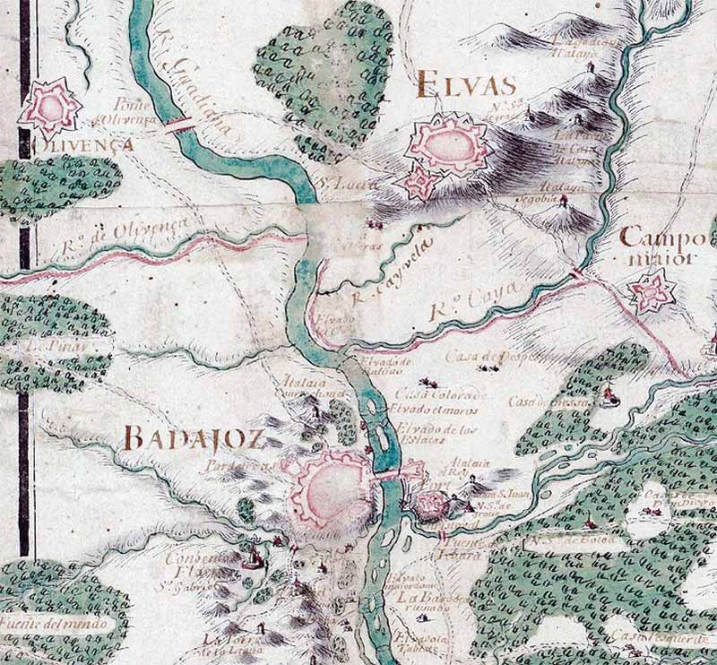 Após um percurso por Talavera, Guadalupe, Mérida e Badajoz os conselhos seguintes referem-se à passagem da fronteira: “a las guardas que les saltarán sobre la puente de Badajoz, que serán dos tropas, una de la Aduana, y la outra del dinéro (…) A la sobreguarda quiçá les saldrá al caminho, lo próprio que en Yélves, que yrán a comer, que es el primero en Portugal, yr a cauallo a la Aduána y de como no llevar cosa de que pagarla, pedir a las guardas de la puente de los quartos de Castilla, y ansi si alguma les a sobrado quando hasta la huelta de Badajoz.
