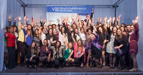 Los VIII Premios Grupo ROS tuvieron en la mujer una protagonista destacada. La concesión del ‘Premio Especial Grupo ROS al fomento del emprendimiento’ a la CEO de Womenalia, María Gómez del Pozuelo, desembocó en la invitación por su parte a todas las mujeres de la gala a subir al escenario para inmortalizar con una fotografía su presencia en el mismo.