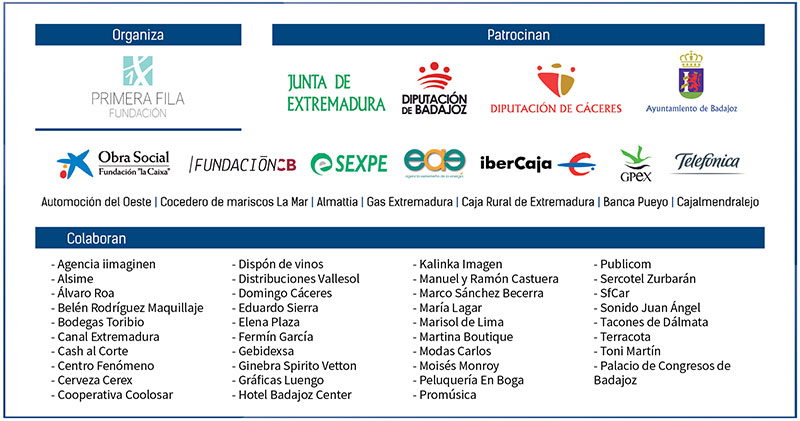 La gala estuvo organizada por la Fundación Primera Fila, entidad sin ánimo de lucro, que entregó su prestigioso galardón al guionista, productor y director de cine pacense Curro Velázquez, por dar visibilidad con su trabajo a los colectivos en riesgo de exclusión. Un año más la gala ha tenido un carácter solidario y los fondos recaudados se destinarán a financiar los proyectos de la Fundación, y específicamente al mantenimiento del proyecto ‘TheraCenter Extremadura’, cuyo centro de Badajoz ofrece a niños y jóvenes con lesiones cerebrales y trastornos neurológicos, de ambos lados de la Raya, la utilización de novedosas terapias, como el método Therasuit, pioneras en el Suroeste ibérico, y que se complementa con tareas de investigación y de formación para los estudiantes universitarios.